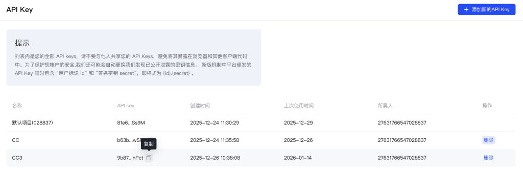 3、点添加新的API Key,名称可以自己随意设置,关键是复制API Key这里的代码,不用特别的保存,以后都可以在这里复制出来。