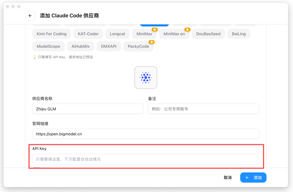 4、往下拉,找到API Key的位置,输入智普创建的API,然后点击添加即可