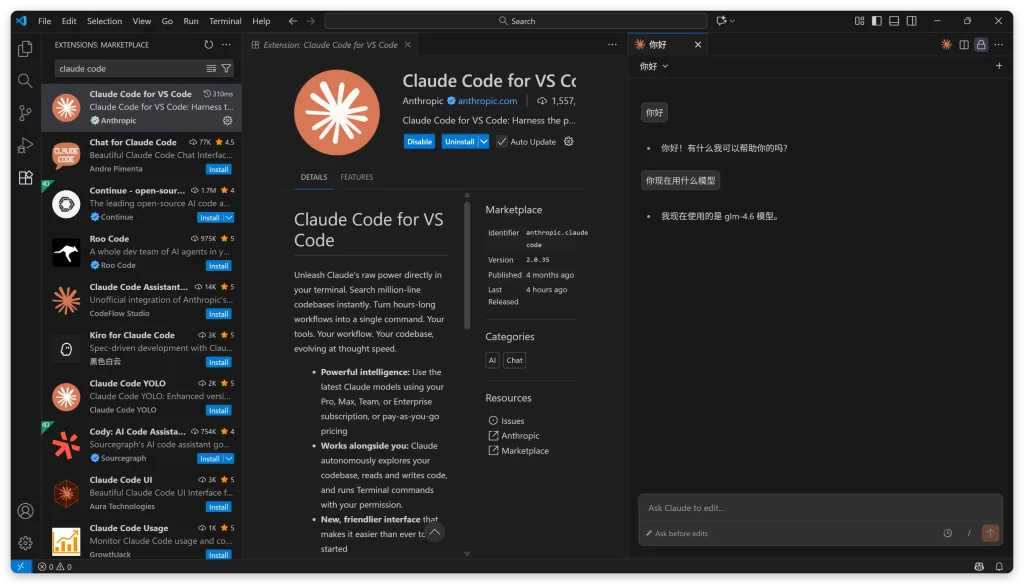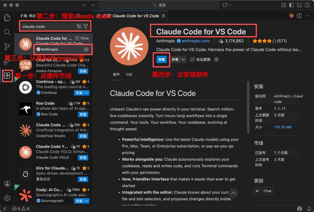 1、打开VS Code后点插件市场,搜索Claude Code,点击安装即可